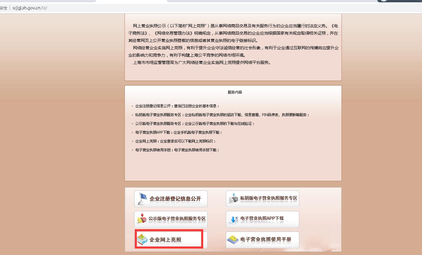 第一步:登錄網(wǎng)址:http://scjgj.sh.gov.cn/lz/,進(jìn)入以下界面。點(diǎn)擊企業(yè)網(wǎng)上亮照